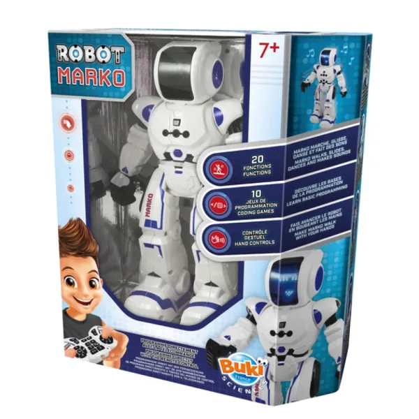 Découvrez Marko Et Ses 20 Fonctions Etonnantes : Marche, Sons Et Musiques, Danse, Emotions… Avec La Telecommande Infrarouge, Programmez Les Actions Du Robot Et Découvrez 10 Jeux Pour S’Initier Au Codage.