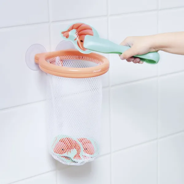 Votre Enfant Va Adorer Pecher Les Crevettes Qui Flottent Dans L’Eau De Son Bain. Il Devra, Ensuite, Les Deposer Dans Un Panier Orange Et Blanc Que Vous Pourrez Fixer Sur La Faience De Votre Salle De Bain Grace A Ses 2 Ventouses.