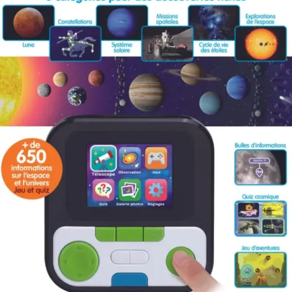Ce Jouet Electronique Educatif Est Adapte Aux Enfants, Des 7 Ans. Ces Derniers Seront Ravis De Découvrir Et Explorer L’Univers Avec Pas Moins De 650 Informations A Découvrir ! De Plus, Ce Ne Sont Pas Moins De 200 Images Et Videos Fournies Par La Nasa Qui Leur Permettront D’Explorer La Lune Et L’Univers Depuis Chez Soi.