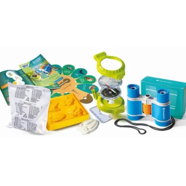 Vous Retrouverez, Dans Ce Coffret Scientifique, Des Jumelles, Une Boussole A Assembler, Un Sachet De Platre, Un Moule A Empreintes, Une Roue En Carton Pour L’Observation Des Oiseaux Et Un Manuel Illustre.