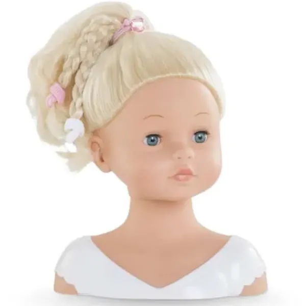 Une Tete A Coiffer Blonde, Avec Des Cheveux Assez Longs Et Une Multitude D’Accessoires Blancs Et Roses, Pour Vous Amuser Avec Ses Cheveux.