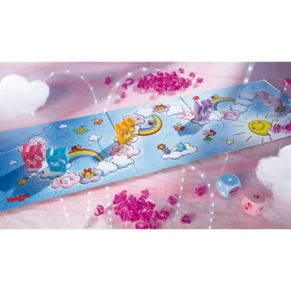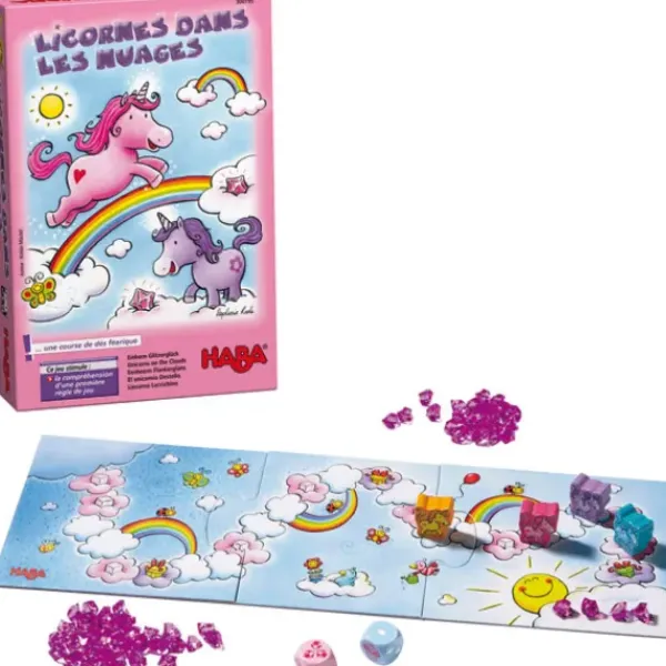 Le Jeu Licornes Dans Les Nuages Est Une Course De Des Feerique. Quatre Licornes Bonheur Etincelant, Poussiere D’Etoile, Fleur Magique Et Tourbillon Magique Habitent Au Lointain Pays Des Nuages. Toutes Joyeuses, Elles Gambadent Sur Les Nuages Cotonneux, Glissent Sur Les Arcs-En-Ciel Multicolores Comme Sur Des Toboggans Et S’Amusent Avec Les Cristaux De Nuage. Mais Voila Qu’Un Orage Se Prepare A L’Horizon ! Aidez Les Licornes A Aller Le Plus Vite Possible Vers Le Soleil ! Qui Aura Ramasser En Chemin Le Plus De Cristaux De Nuage ?
