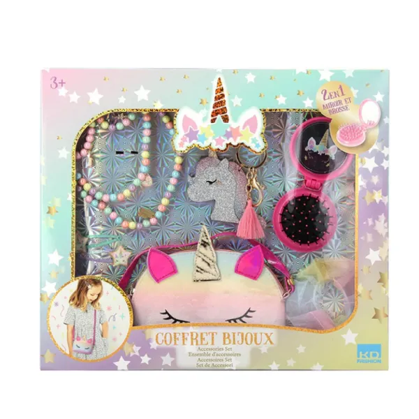 Deux Parures De Bijoux Elegantes Qui Se Composent D’Un Collier Et D’Un Bracelet Accompagnees De Boucle D’Oreilles, D’Un Chouchou, De Barrettes, D’Un Porte Cles Et D’Un Sac Licorne Vont Faire A Coup Sur Craquer Toutes Les Fans De Licorne. Une Brosse 2 En 1 Miroir Et Brosse Complete L’Ensemble.