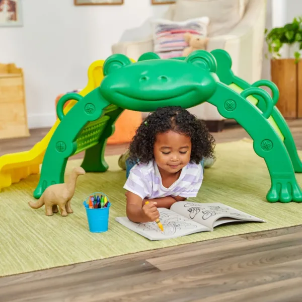 Les Plus Petits Seront Heureux D’Avoir Un Mur En Arc Pour Grimper Sur Le Dos De La Grenouille Et Descendre Un Toboggan Adapte A Leur Taille. Les Poignees Laterales Ameliorent La Confiance Et L’Autonomie. Ils Pourront Ramper Sous La Grenouille Et Se Cacher.