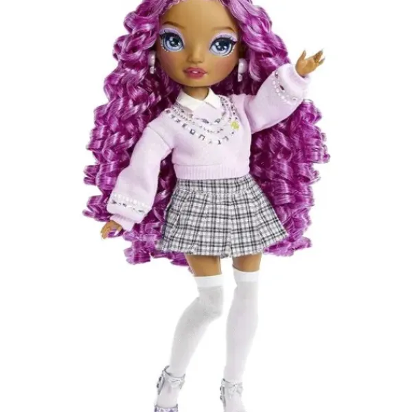 La Poupee Rainbow High Est Une Veritable Icone De La Mode. Avec Ses Cheveux Boucles Violets, Ses Vetements Tendances Et Ses Accessoires Scintillants, Elle Saura Captiver L’Imagination De Votre Enfant. Elle Est Habillee D’Un Pull Parme Avec Des Strass Au Niveau Du Col Et Des Poignets, D’Une Jupe Courte A Petit Carreau Noir Et Blanc, De Chaussette Longues Blanches, De Boucles D’Oreilles Argentees Et D’Une Paire De Chaussures A Talon Argentee.