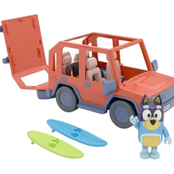 Comme Bluey Faites De La Vie Une Aventure Quotidienne Et Ludique. Pratique, Le Toit De La Voiture S’Ouvre Afin De Placer Ses Figurines Facilement. Avec Un Rail Pour Fixer Les Planches De Surf Sur Le 4X4.