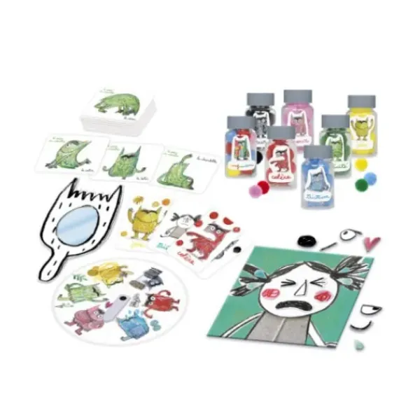Le Coffret Contient Des Cartes Pour Apprendre A S’Observer Et A Mimer Les Emotions Grace Au Miroir Du Monstre, Des Flacons A Remplir De Pompons Qui Invitent A Associer Une Couleur Par Emotion. La Roue Des Emotions Aide Ensuite A S’Exprimer Sur Ses Emotions Et Le Yoga Du Monstre Qui Presente Onze Postures De Relaxation Ainsi Que Leurs Benefices.