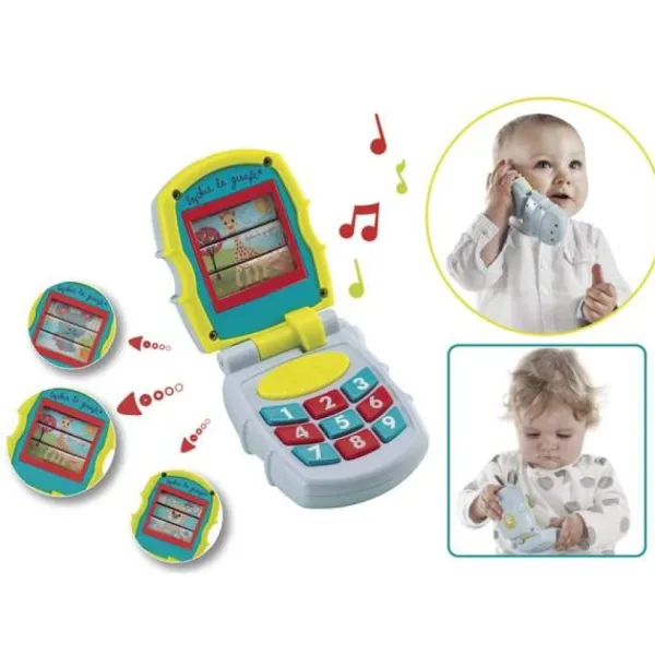 – Un Telephone Musical Et Lumineux : Un Portable Musical A Clapet A Ouvrir Et Fermer Pour Voir Apparaitre Tour A Tour Josephine La Souris, Gabin L’Ours Et Sophie La Girafe ! 5 Melodies Differentes Et Des Sons A Découvrir.